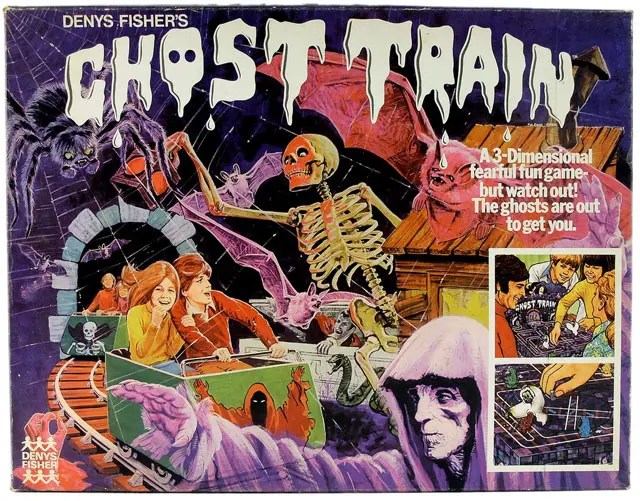 The lengths some of us thrill-seeking individuals will go in the hunt for the next great scare! Based on an amusement park ride, Ghost Train boasts some board game box art that hits all the most terrifying notes. A gargantuan collection of spiders, skeletons, bats and, well, some guy in a hood facing the wrong direction can be found looming over some innocent children who have obviously been petrified into appearing that they are having a good time. Clearly this is a lie: How could anyone see Dracula hanging from a Buick and find that amusing in any way? Prepare to find yourself awash in fear and confusion when gazing upon this board game box art and the two bonus, inset scenes of terror!
