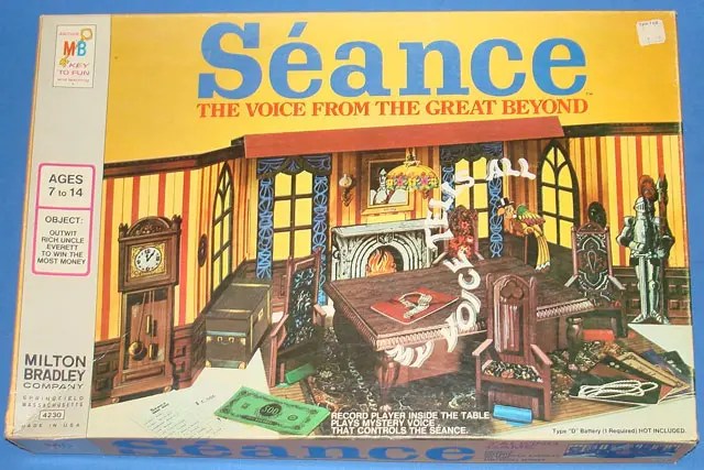 Sometimes, the scariest thing imaginable is the thing you can’t see (and every horror movie agrees); the fear of the unknown trumps anything you might know. It’s this reason why the art for Séance remains so frightening. Depicting a simple living room set-up, the board game box betrays a sense of foreboding by depicting a hollow suit of armor, an enormous dollar bill and what appears to be a two-dimensional grandfather clock—something is not quite right. And it doesn’t end there: Much like a Magic Eye puzzle, the true nature of this scene reveals itself only after much staring and straining of the eye. Notice the words emanating from below the table, “My voice tells all.” What mysteries will this reveal? What spirits will conjure themselves when you start playing? Does the building have a roof? Questions without answers are horrific.